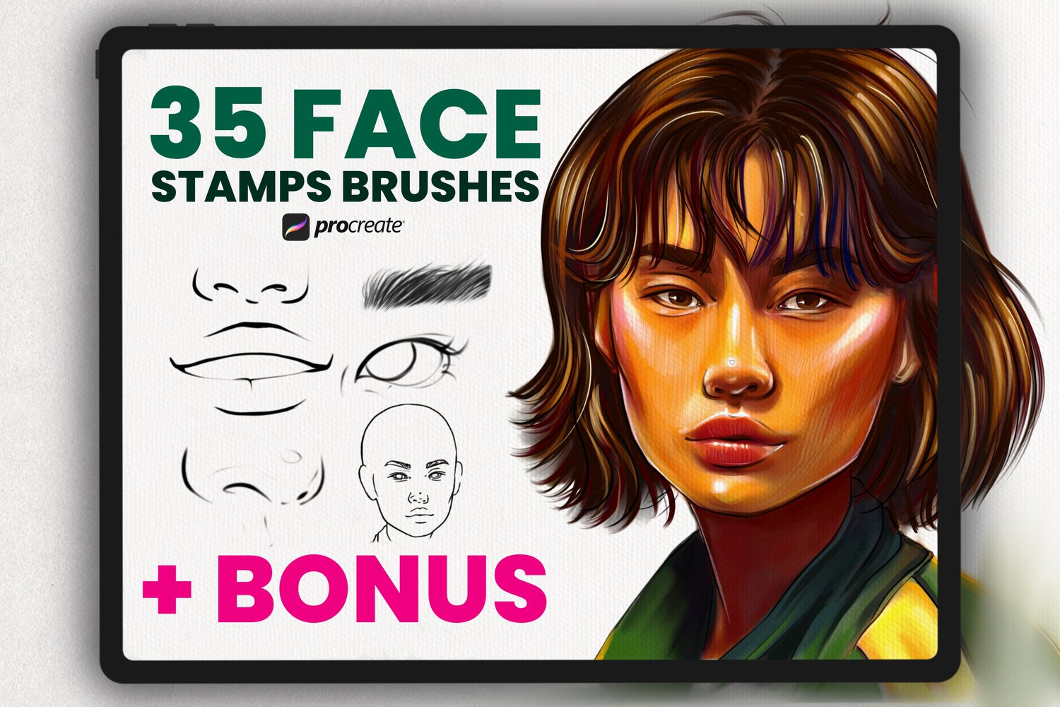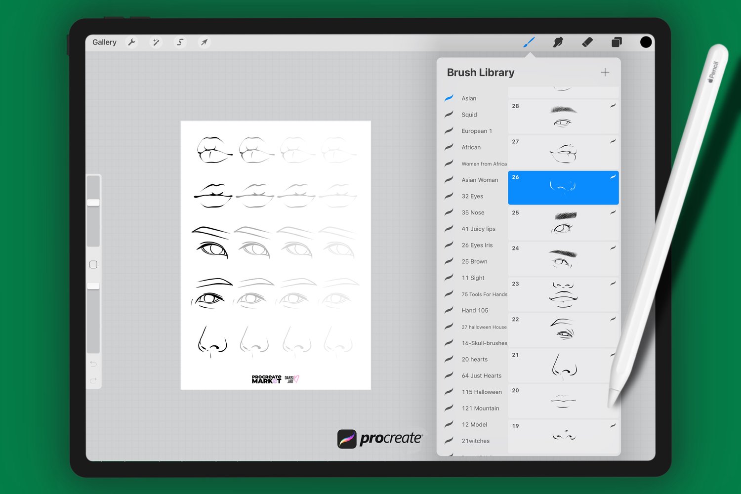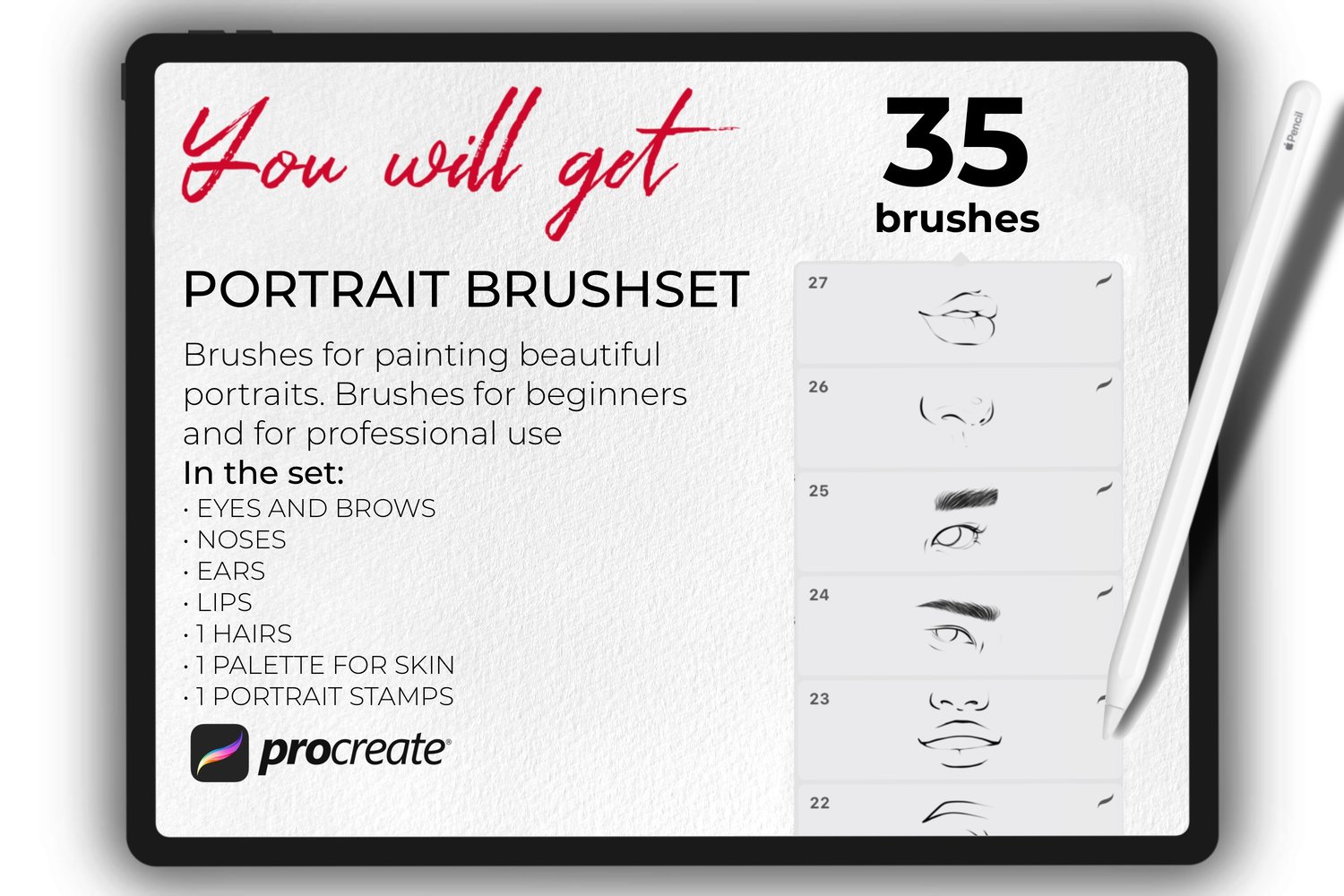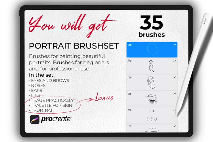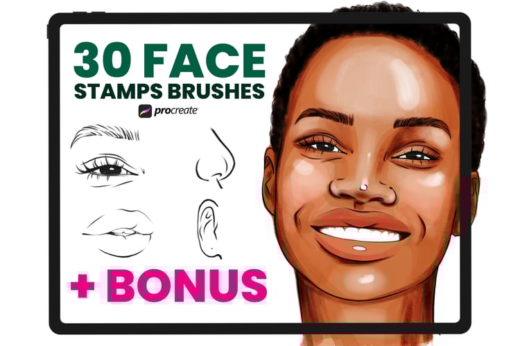 - Set of 35 various face stamp brushes for Procreate App. Eyes, Brows, Noses, Ears, Lips, 1 Hairs, 1 Palette for Skin,1 Portrait Stamps.