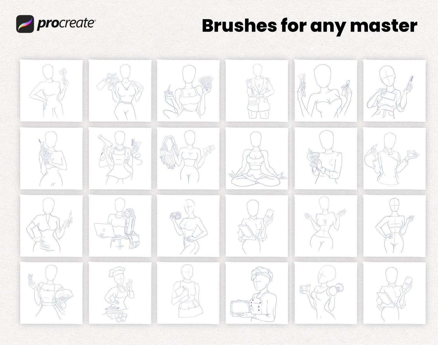 In this set, you will get Logo Portrait Stamp Brushes to Procreate for creative projects. The advantage of these brushes for Procreate is that you don't have to paint the shape yourself, everything is drawn for you. Use the template you need and paint the portrait and hair, color the picture and your illustration is ready!