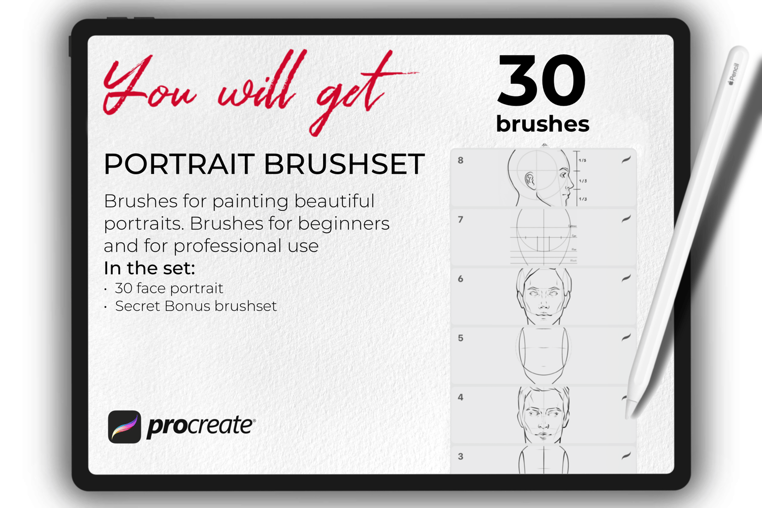 - Set of 30 various portrait face & head guide stamp brushes for Procreate App