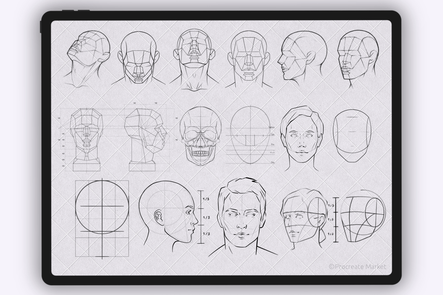 In this set, you will get Portrait Face & Head Guide Stamp Brushes to Procreate for creative projects. Excellent head guide stamps for drawing portraits, especially suitable for beginner artists to learn and improve skills, as well as more experienced artists to speed up the process of drawing portraits.